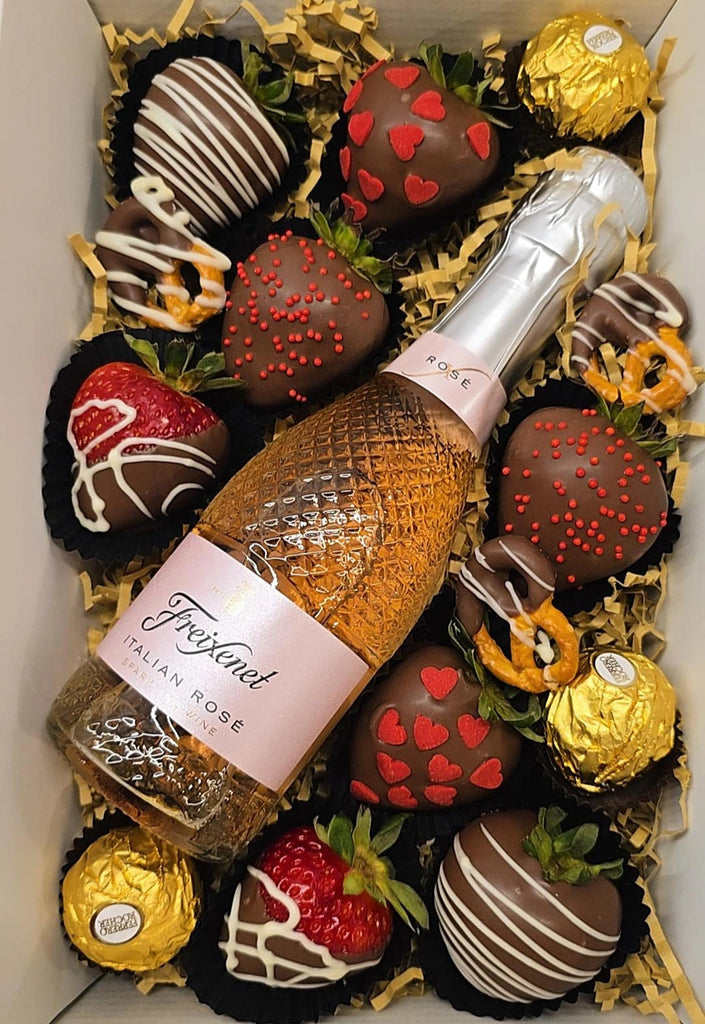 Indulge in a perfect pairing of sweetness and sophistication with our Sparkling Romance Gift Box. This delightful set includes a 200mL bottle of Sparkling Moscato Rosa, a refreshing, aromatic wine with vibrant bubbles and a hint of floral elegance, paired with 8 luscious chocolate-dipped strawberries. Each berry is carefully hand-dipped in rich, velvety chocolate, creating a decadent treat that's as beautiful as it is delicious.
